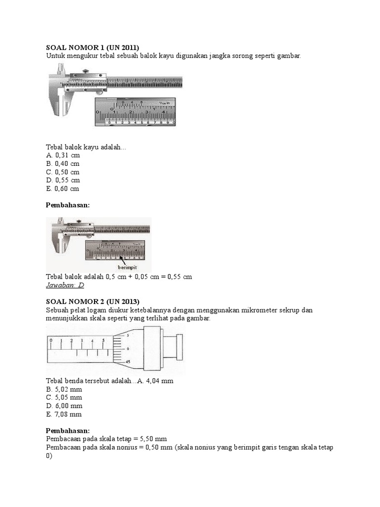 Pengukuran menggunakan jangka sorong dan mikrometer skrup. Namun begitu, mikrometer sekrup ini juga terdiri dari banyak jenis dan model yang sangat tergantung dari fungsi mikrometer sekrup itu sendiri seperti contohnya untuk mengukur kedalaman (depth micrometer), mengukur ketebalan luar (outside micrometer), serta untuk mengukur kertebalan (inside. Gambar di bawah ini menunjukan pengukuran lebar balok menggunakan jangka sorong. Cara buat gambar soal jangka sorong dan mikrometer sekrup mudah dan cepat ga nyampe 5 menit jadi! Pada mikrometer sekrup memiliki poros tetap yang berperan sebagai skala utama dan poros putar yang berperan sebagai skala nonius. Jadi jawaban untuk soal pertama bilangan berikutnya adalah : Soal dan pembahasan gaya coulomb 12149 views. Dampak pembakaran hidrokarbon dan minyak bumi. 15 contoh soal pilihan ganda senyawa hidrokarbon dan pembahasannya. Mikrometer sekrup adalah alat ukur. Contoh soal matematika kelas 5 semester 2 kurikulu. Suatu barisan aritmatika diketahui mempunyai suku pertama 25 dan suku kesebelas nya ialah 55. Pada gambar di atas menunjukkan bahwa skala utama pada mikrometer sekrup terlihat di angka 2 mm dan skala nonius di angka 0,12 mm, sehingga ukuran benda tersebut dibaca 2 mm + 0,12 mm = 2,12 mm.